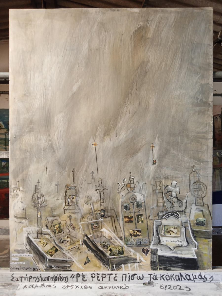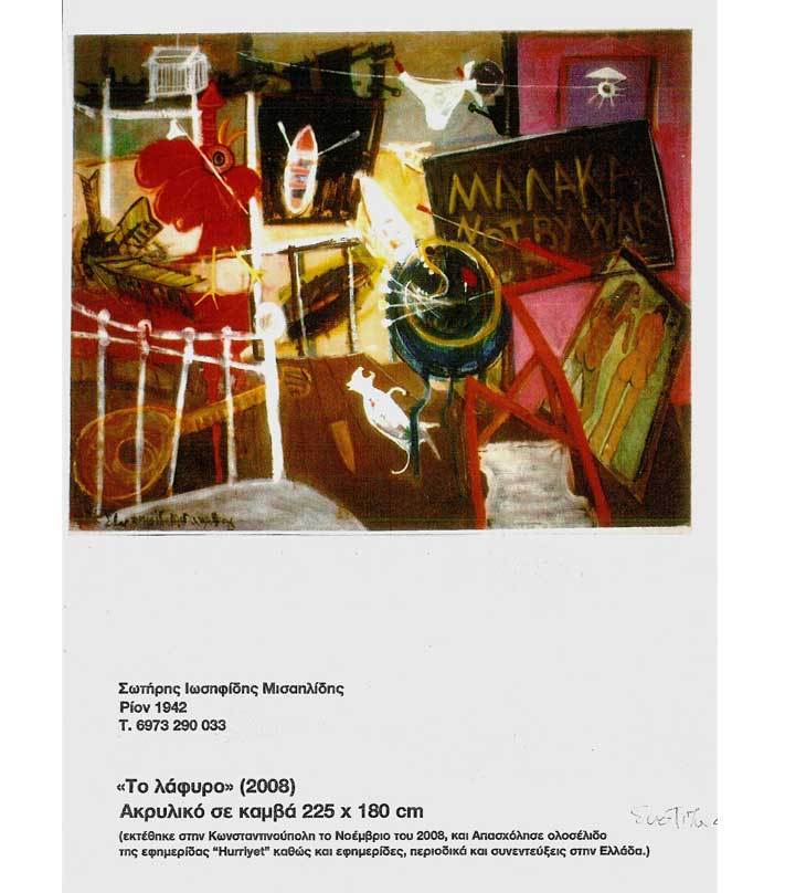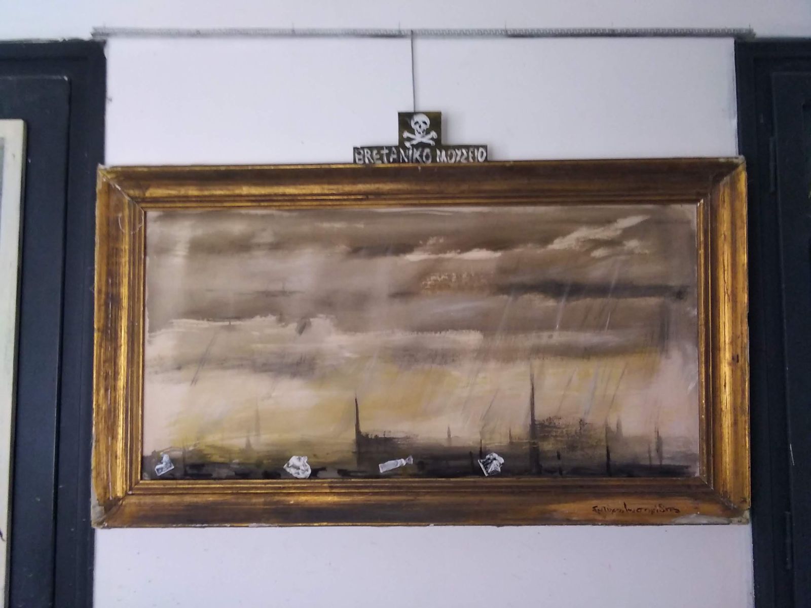 Γράμμα στην αυτού Βασιλική Υψηλοτήτα τού βασιλιά Κάρολου και στον πολιτισμένο αγγλικό λαό στέλνω πρώτα τις ευχές μου στον βασιλιά για την υγεία του και μετά το εικαστικό μου μανιφέστο για τον Παρθενώνα του κόσμου “ΦΕΡΤΕ ΠΙΣΩ ΤΑ ΚΟΚΚΑΛΑ ΜΑΣ”. Καμβάς, ακριλικό και κολάζ μεγάλων διαστάσεων 2’45χ1’85. Επίσης τα άλλα επόμενα έργα μου από το ίδιο θέμα, μικρών διαστάσεων που τα ονομάζω “Πέττομαι” προτείνονται στους φιλότεχνους και συλλέκτες σαν αγωνιστική συμμετοχή για την υστεροφημία μας, στο ιστορικό εικαστικό μας μανιφέστο.